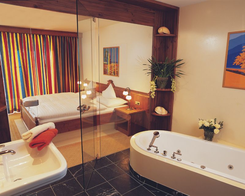 SUITE (ca. 45 m²)vergrößerter Wohnbereich mit Sitzecke, Balkon/Terrasse, Whirlbadewanne, Dusche, WC separat, Kosmetikspiegel, Haarfön, SAT-TV, Radio, Telefon, ADSL, Minibar, Zimmersafe, Tiefgaragenplatz